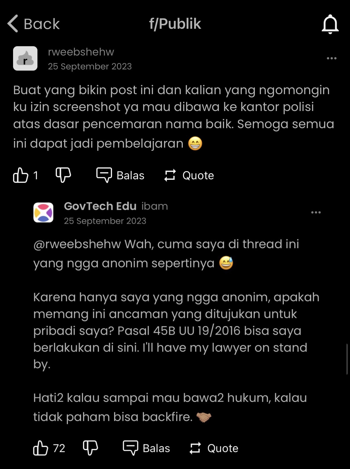 @rweebshehw Wah, cuma saya di thread ini yang ngga anonim sepertinya •.. Karena hanya saya yang ngga anonim, apakah memang ini ancaman yang ditujukan untuk pribadi saya? Pasal 45B UU 19/2016 bisa saya berlakukan di sini. I'll have my lawyer on stand by. Hati2 kalau sampai mau bawa2 hukum, kalau tidak paham bisa backfire.